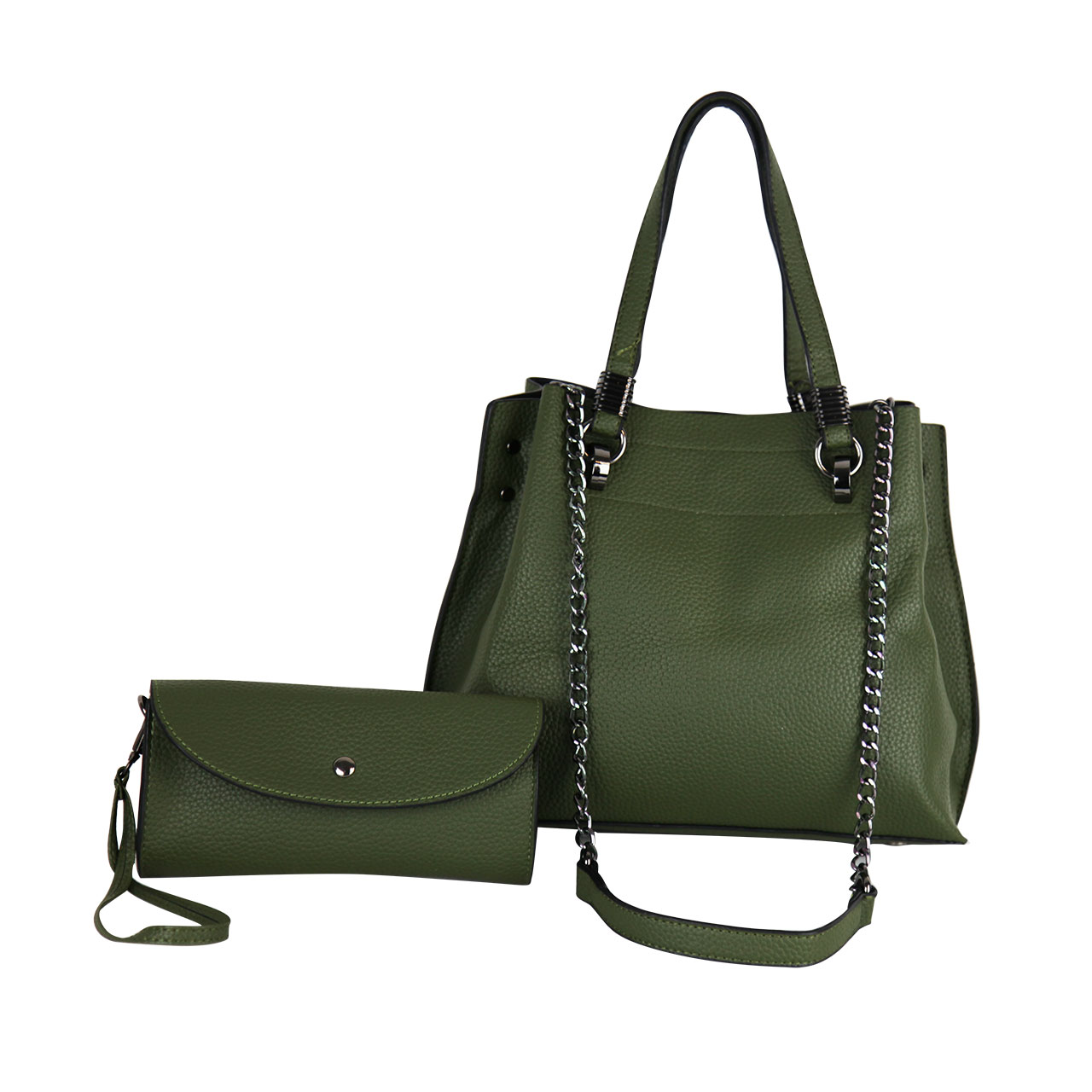 Women Classic Structured Tote Shoulder And Clutches Green Leather Two Piece Set With Metal Chain Straps