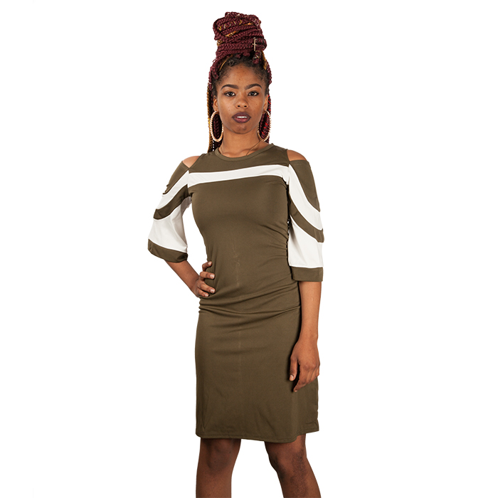 Women s Cold Shoulder Knee Length Olive Green With White Flared Sleeve Bodycon Dress