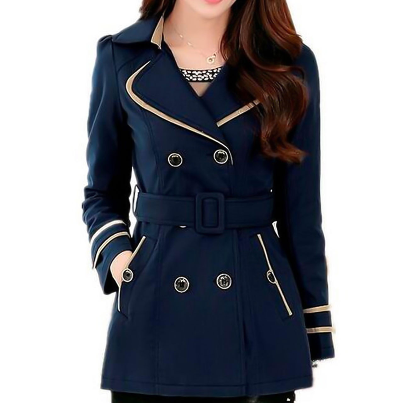 Daily Fold Over Collar Plain Navy Blue Spring Jacket Trench Coat Women Blue